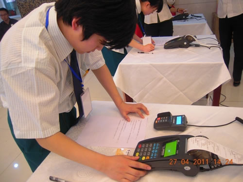 參賽選手熟練、準(zhǔn)確無(wú)誤的操作POS系統(tǒng),做到刷卡流程準(zhǔn)確、速度穩(wěn)定